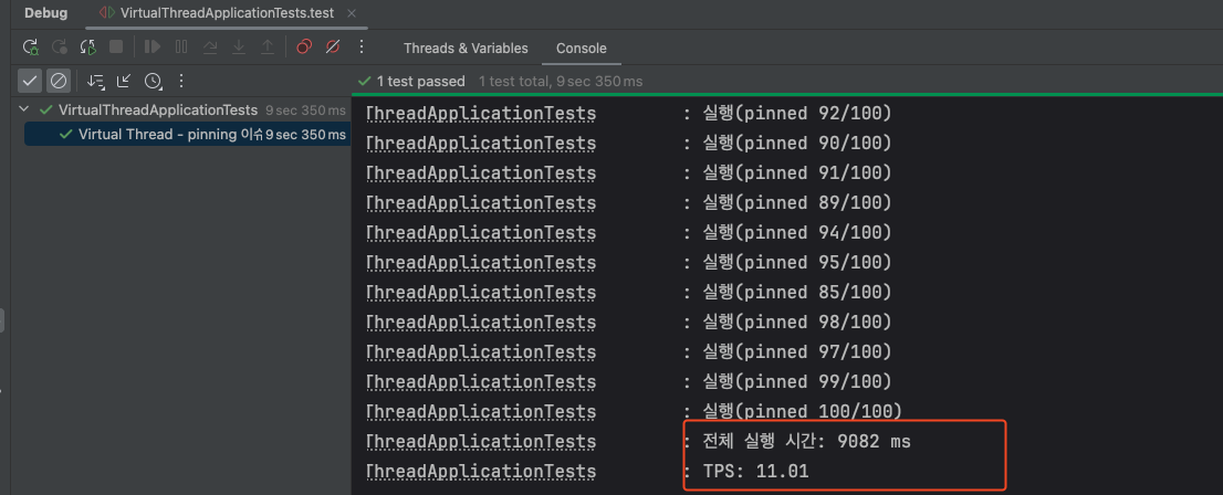 테스트 코드를 실행해보면, 총 9초 정도의 시간이 소요됐고, TPS는 11.01로 측정된 것을 확인할 수 있다.