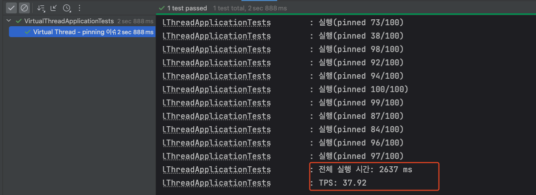 테스트 코드를 실행해보면, 총 2.6초 정도의 시간이 소요됐고, TPS는 37.92로 측정된 것을 확인할 수 있다.