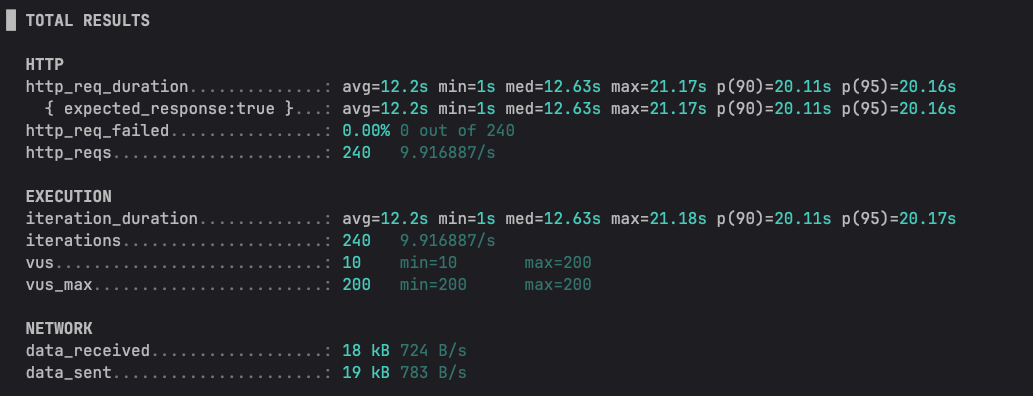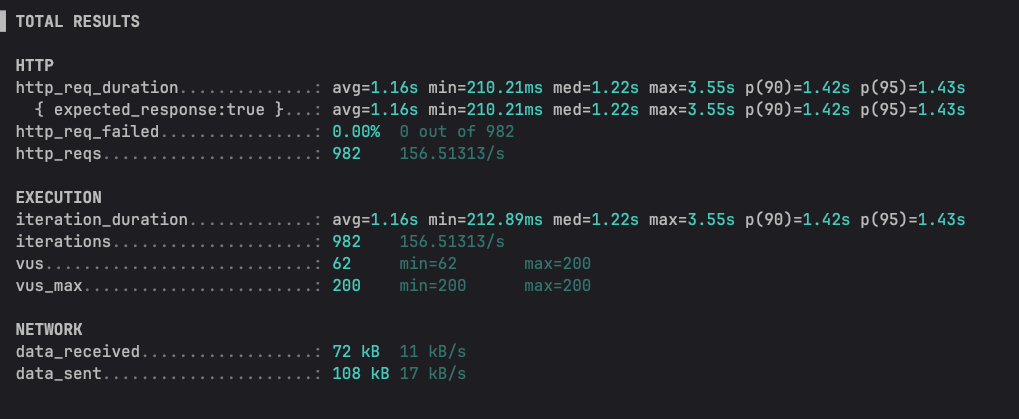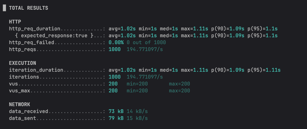 이전 섹션에서 사용한 K6 테스트 코드를 실행한 직후에 프로메테우스 지표를 찍도록 명령어를 구성하였고, 실행 결과는 아래와 같다.