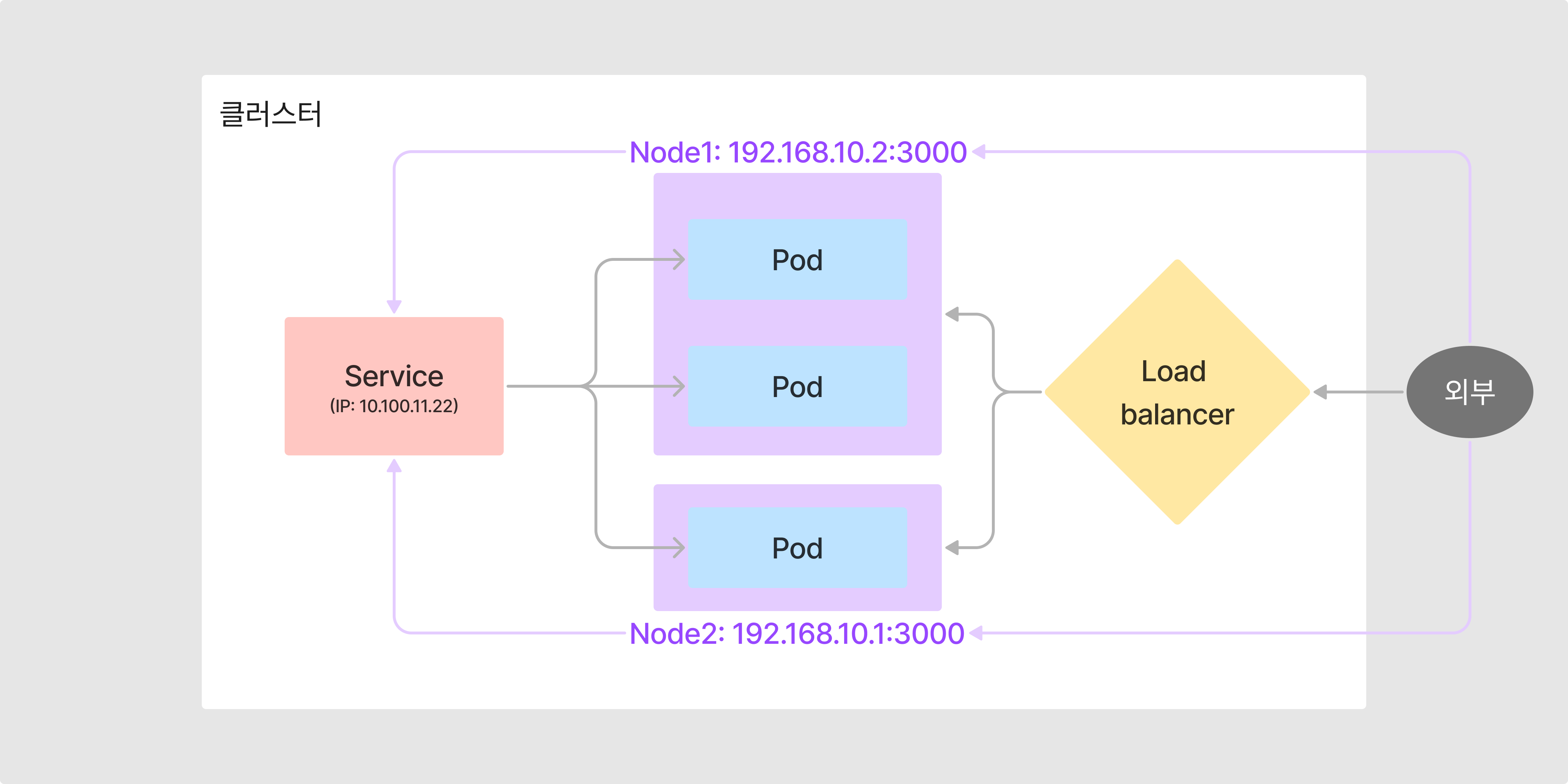 Load balancer (이하, LB)는 NodePort의 동작 방식에서 LB 추가된 것이다.