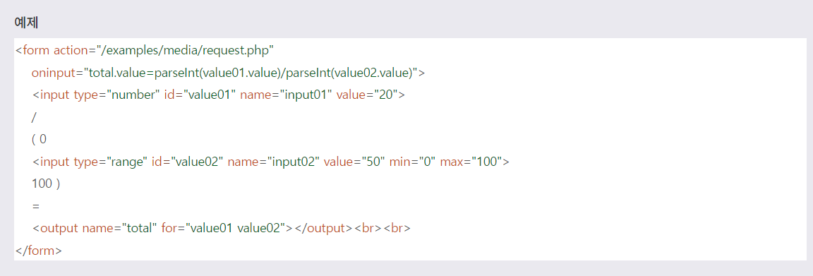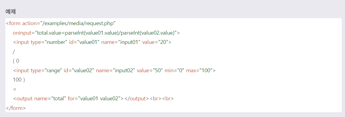 - output 요소는 스크립트(script) 등으로 실행된 계산의 결과를 바로 표시해주는 요소입니다.