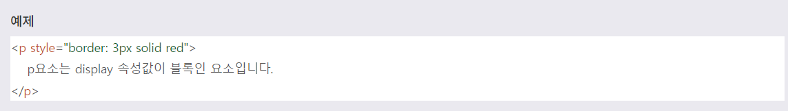 - display 속성값이 블록(block)인 요소는 언제나 새로운 라인(line)에서 시작하며, 해당 라인의 모든 너비를 차지합니다.