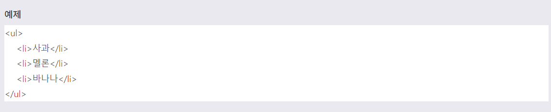 - 순서가 없는 리스트는 ul태그로 시작하며, 여기에 포함되는 각각의 리스트 요소는 li태그로 시작합니다.