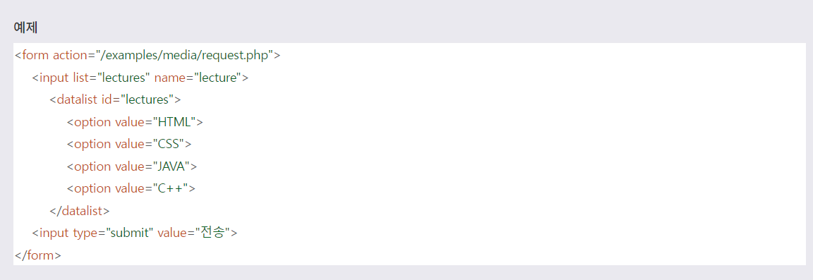 - datalist 요소는 input 요소에 대해 미리 정의된 옵션 리스트를 명시해 주는 요소입니다.