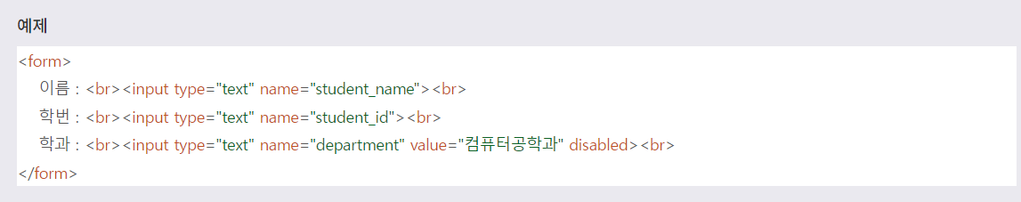 - disabled 속성은 사용자가 입력 필드를 아예 사용할 수 없도록 설정합니다.