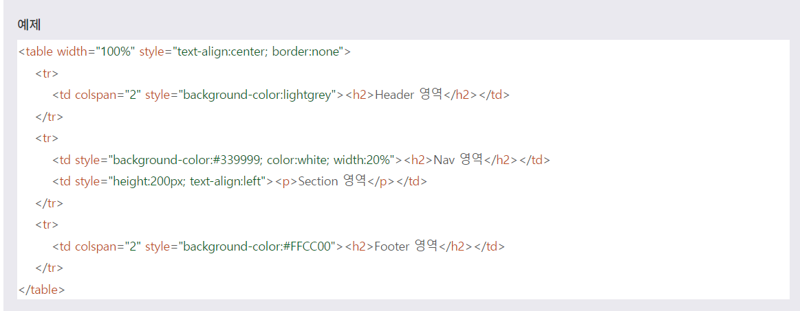 - table 요소를 이용하여 레이아웃을 작성하는 방법은 오래전에 사용하던 방식이며, 현재는 거의 사용하지 않습니다.