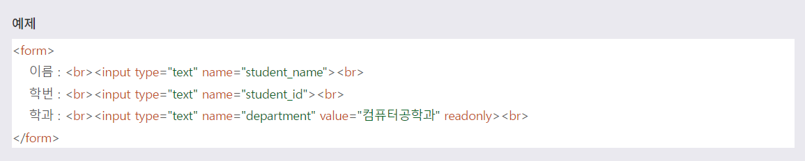 -disabled 속성과 다른 점은 전송 버튼(submit)을 누르면 초깃값이 서버로 전송된다는 점입니다.