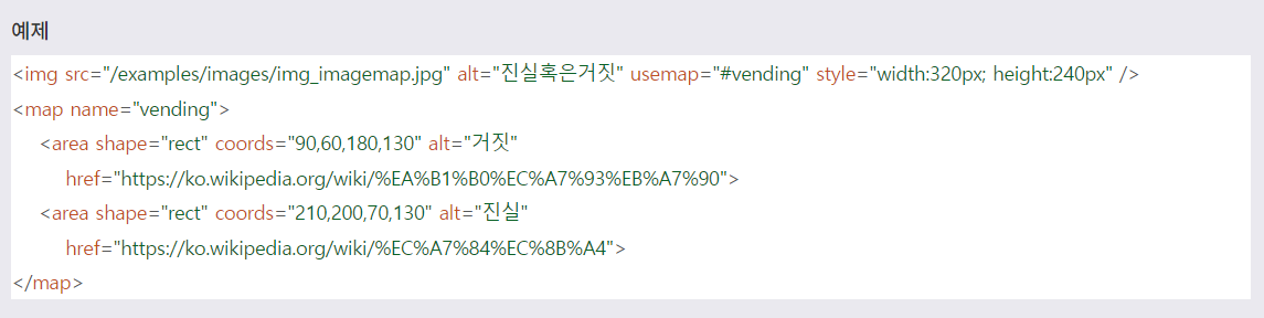 - img태그의 usemap 속성을 map태그의 name 속성과 연결하면 이미지와 맵사이의 관계가 설정됩니다