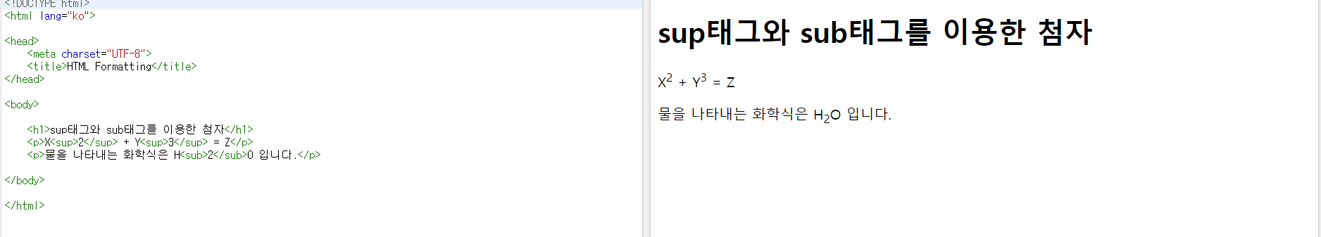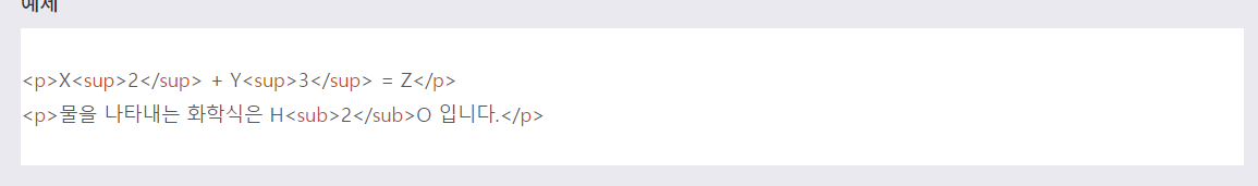 - 위첨자는 sup태그를 사용하여, 아래첨자는 sub태그를 사용하여 각각 표현할 수 있습니다.