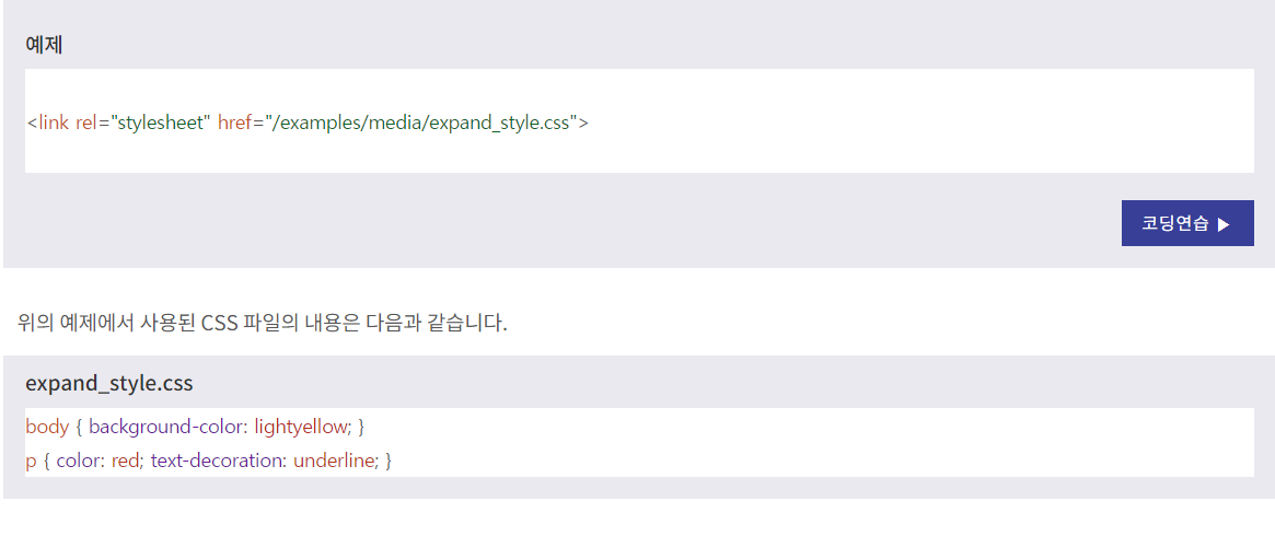 - 스타일을 적용할 모든 웹 페이지의 head태그 내에 link태그를 사용하여 외부 스타일 시트를 포함하면 됩니다.
