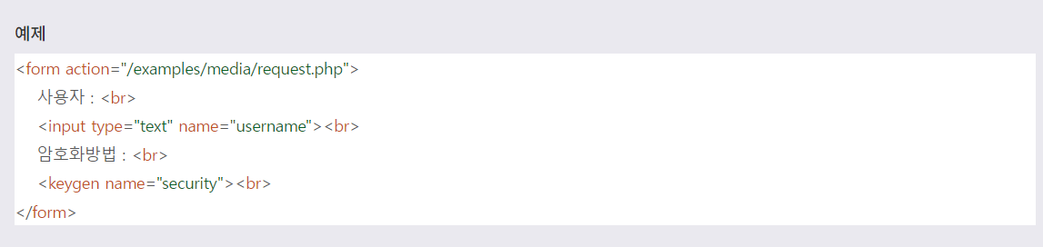 - keygen 요소는 사용자가 입력한 데이터를 암호화하여 서버로 전송합니다.