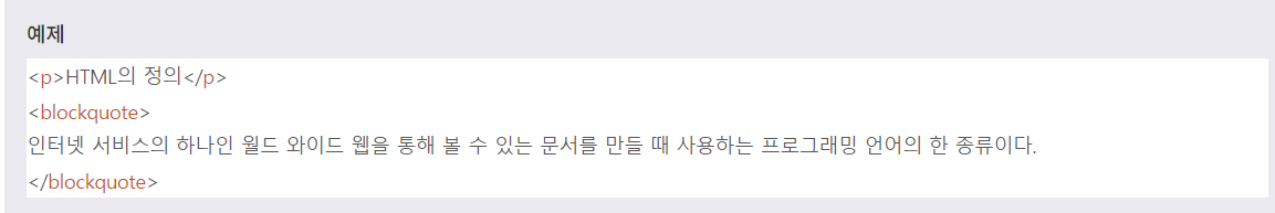 - blockquote태그를 이용하여 이러한 인용 부분을 별도의 단락으로 구분하여 나타냅니다.