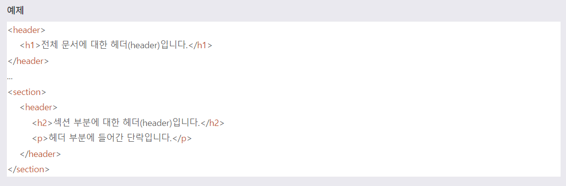 - HTML 문서나 섹션(section) 부분에 대한 헤더(header)를 정의합니다