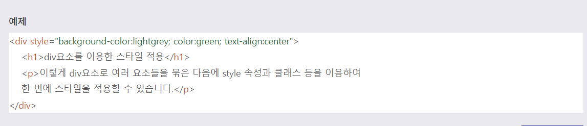 - div요소는 주로 여러 요소들의 스타일을 한 번에 적용하기 위해 사용됩니다.