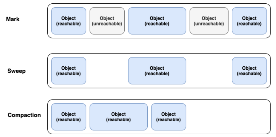 가비지 컬렉션이 될 대상 객체를 식별(Mark)하고 제거(Sweep)하며 객체가 제거되어 파편화된 메모리 영역을 앞에서부터 채워나가는 작업(Compaction)을 수행하게 된다