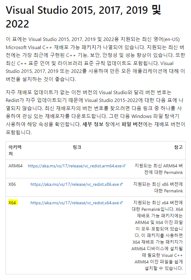 https://learn.microsoft.com/ko-KR/cpp/windows/latest-supported-vc-redist?view=msvc-170