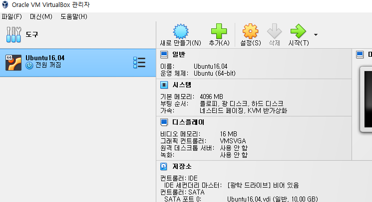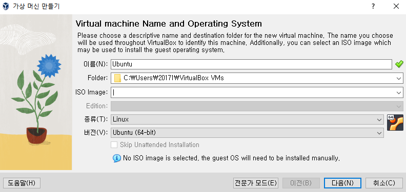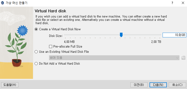 기본 메모리 4GB 정도에 CPU는 1개, 하드디스크는 10GB 정도로 세팅