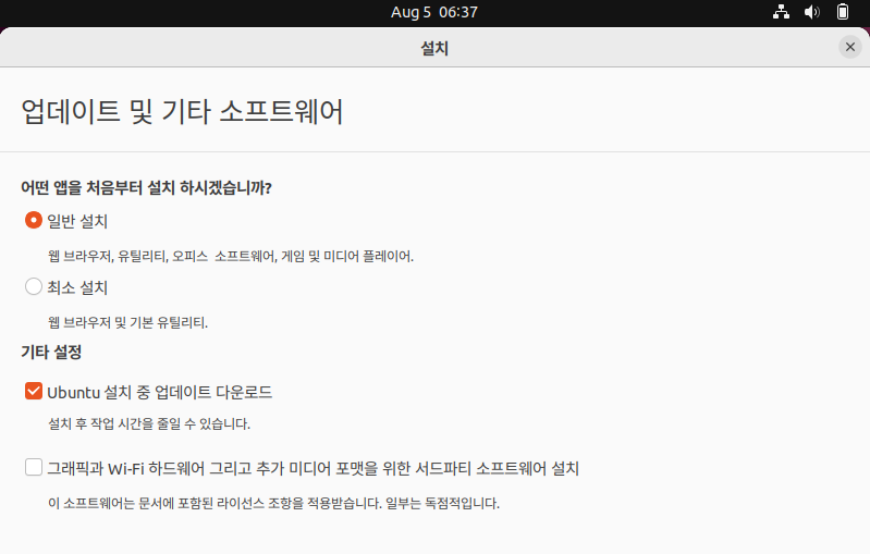 일반선택 -> Ubuntu 설치 중 업데이트 다운로드