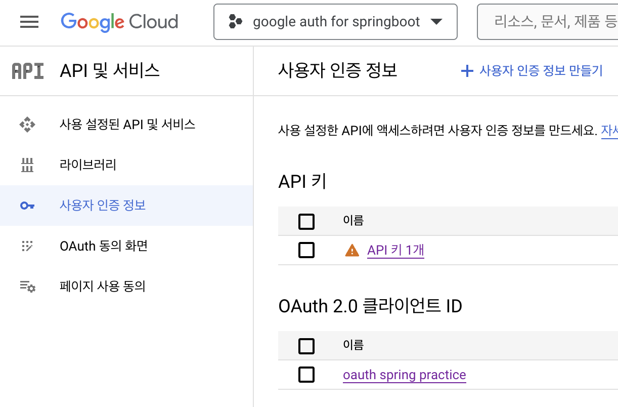 만약 없다면 사용자 인증 정보 만들기에서 OAuth2.0 클라이언트 ID를 만들어야 합니다.