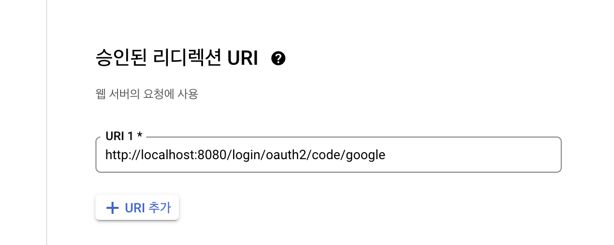 만약 SpringBoot에서 제공하는 Oauth Client dependency를 사용하고 있다면 http://localhost:8080 까지는 원하는 도메인으로 수정할 수 있는데, /login/oauth2/code/google은 고정입니다! 다만 facebooke로그인이라면 google 대신 /login/oauth2/code/facebooke 등 뒤에 부분만 다릅니다.