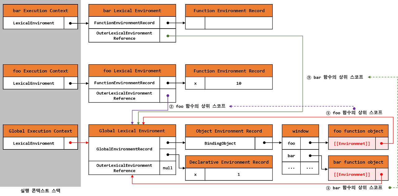 bar 함수를 호출하면 렉시컬 환경이 포함하는 Environment Record에 x라는 식별자가 존재하는지 파악한 후 존재하지 않을 경우 상위(Outer) 스코프로 이동하여 x를 찾는다.