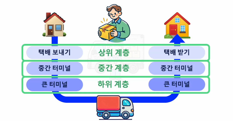- 택배를 A에서 B로 보내기 위해서는 택배를 포장하고 이동하고 택배 포장을 뜯는 과정이 필요