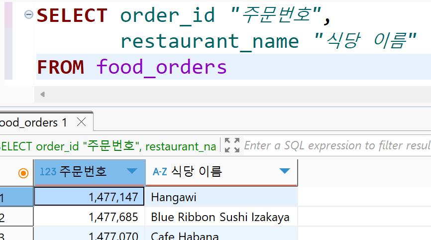 ⬆️ order_id → 주문번호, restaurant_name → 식당이름