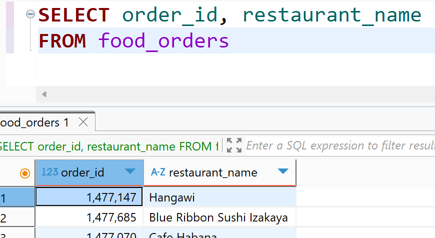 ⬆️ food_orders 테이블에서 order_id, restaurant_name 컬럼을 가져온 경우