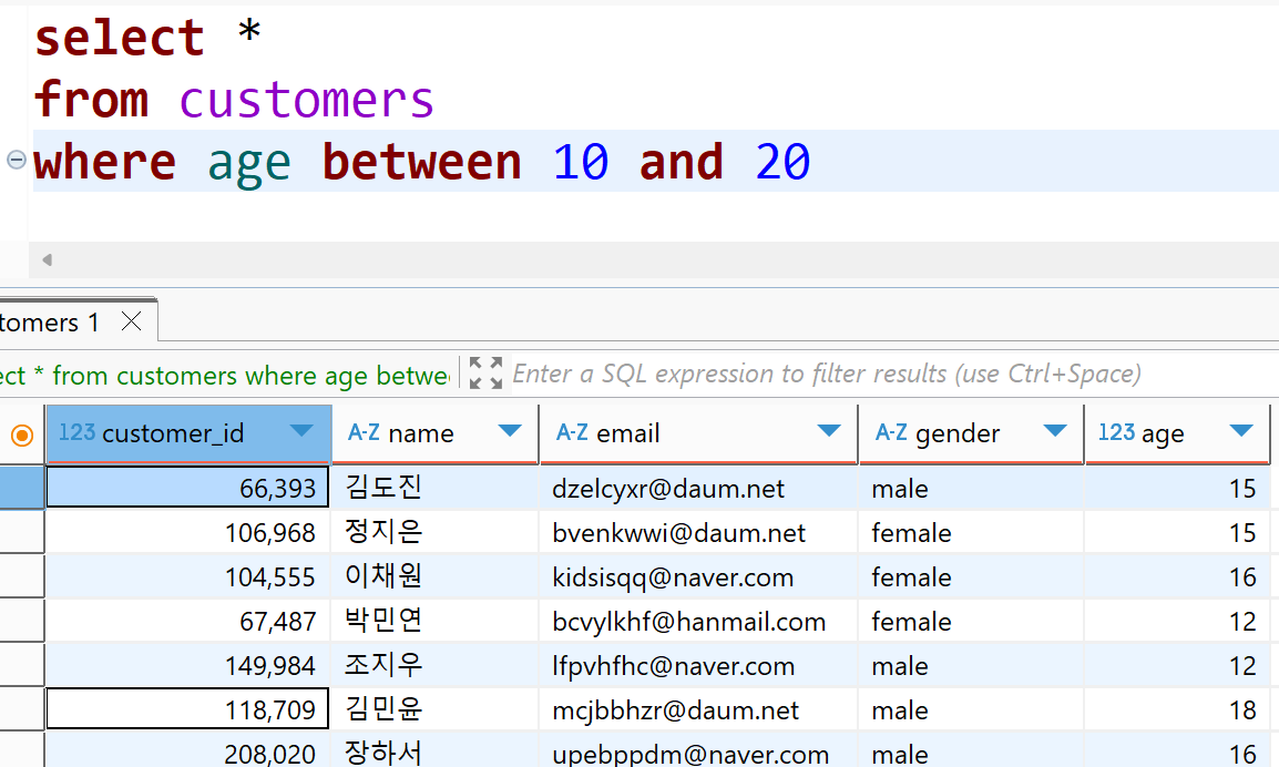 ⬆️ 예시 : 나이가 10과 20 사이