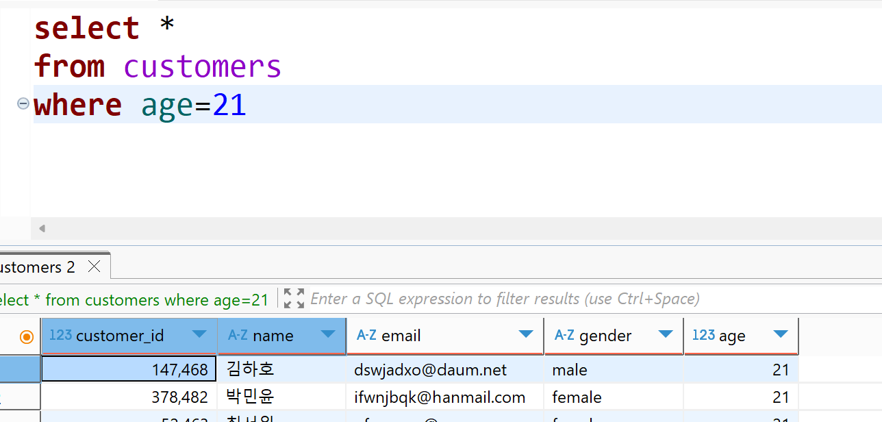 ⬆️ 고객 (customers) 테이블에서 21살인 사람을 필터링