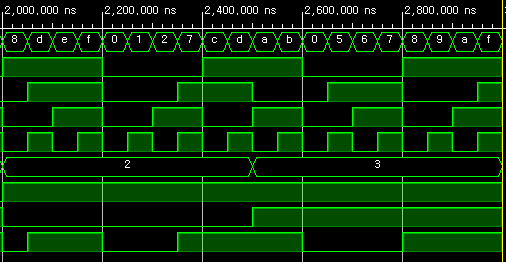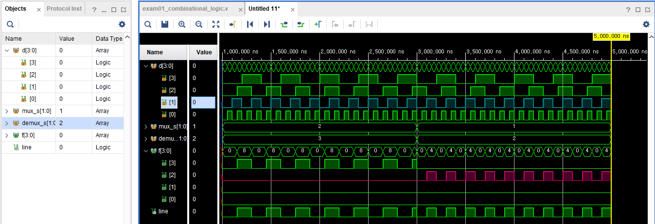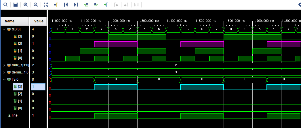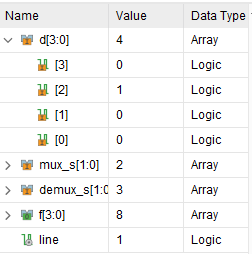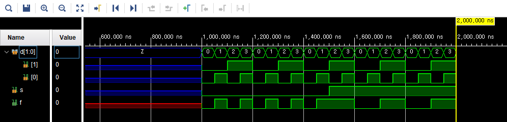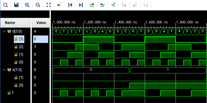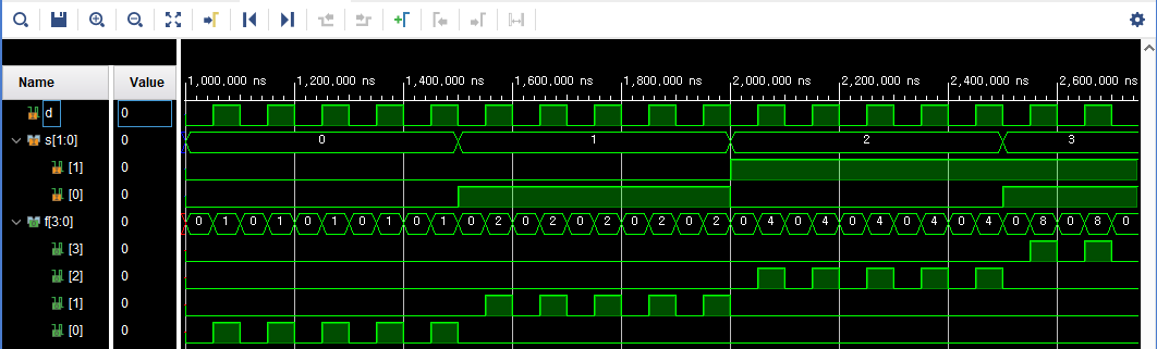 s값이 0,1,2,3 변할때 그에 맞는 출력값 f의 인덱스에 출력된다 입력d의 값(파형)이 그대로 출력