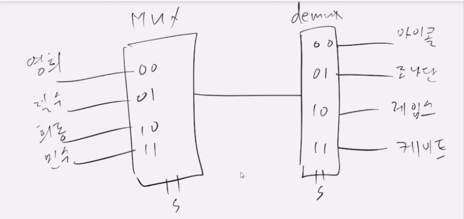 역할 : 단일 입력 신호를 받아 이를 여러 출력 중 하나로 분배하는 장치.