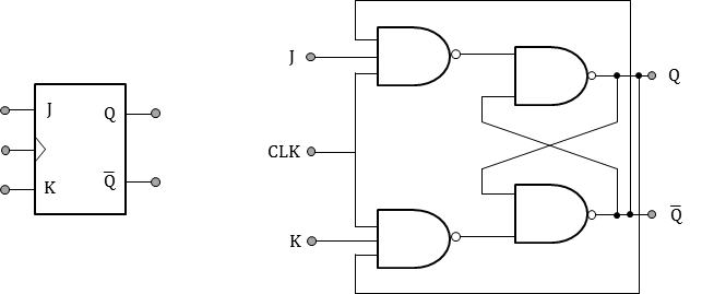 JK는 직접회로를 최초로 발명한 미국의 물리학자 잭 킬비(Jack Kilby)를 기념하기 위해 붙인 이름. RS 플립플롭의 S에 해당하는 것이 J, R에 해당하는 것이 K 이다. RS의 (1,1)은 금지 이지만 JK의 (1,1)은 토글 동작