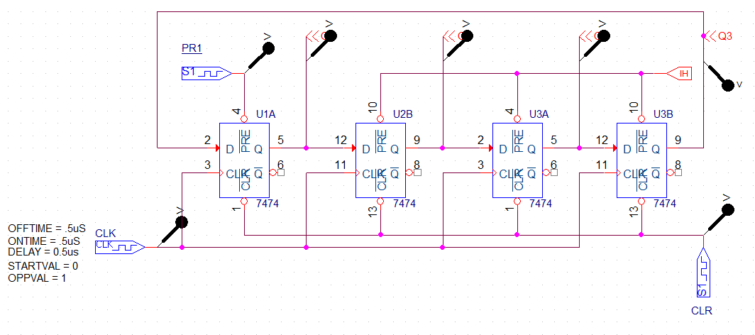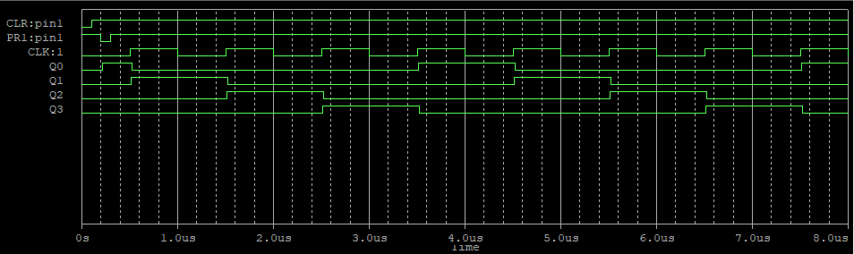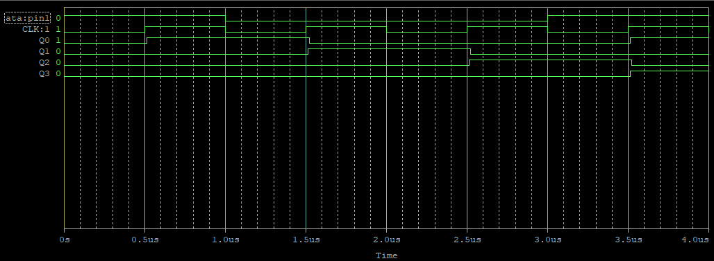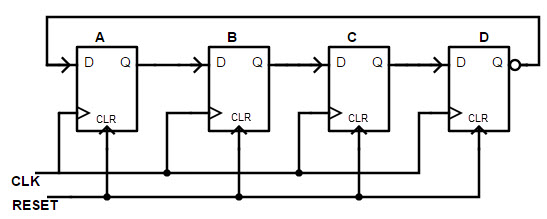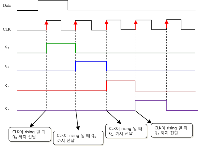 PR1을 통해 Q0만 1로 주고 그이후 클럭에 따라 쉬프트 레지스터처럼 동작하고 Q3값을 다시 Q0가 읽는다, 링 카운터의 Q0는 다음 상승엣지일때 피드백에의해 Q3의 값을 읽는다