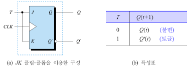 T 플립플롭은 JK 플립플롭의 입력 JK를 하나로 묶어 입력 T(Toggle)를 만든 것, 이렇게 해서 JK 플립플롭의 토글 동작만을 사용하게 된다