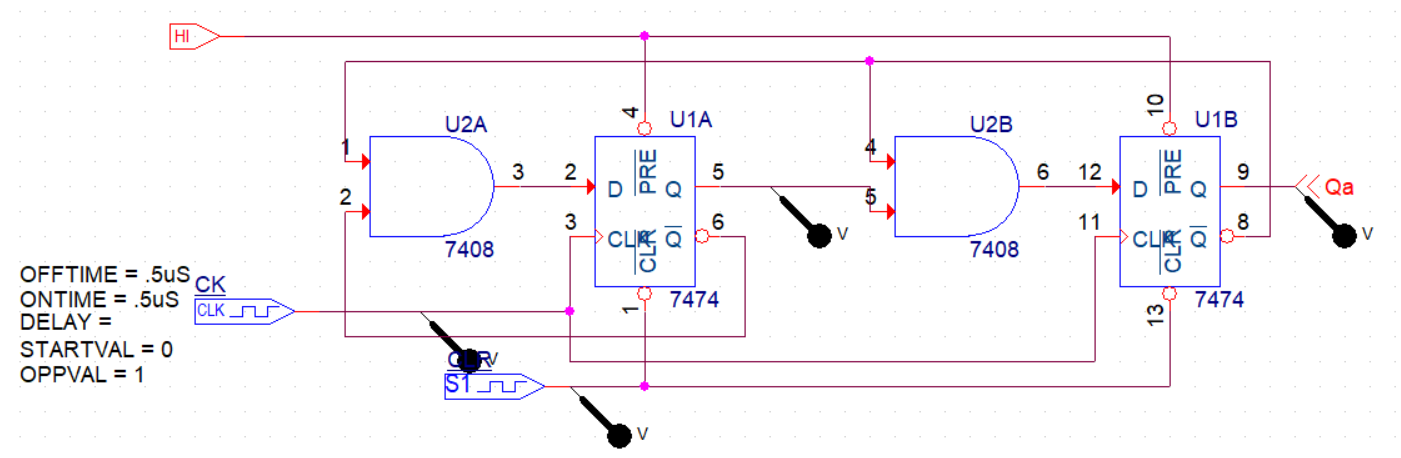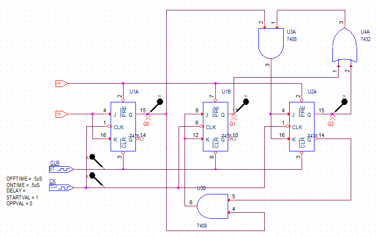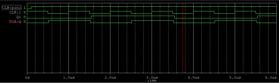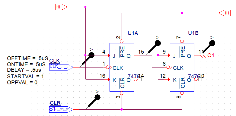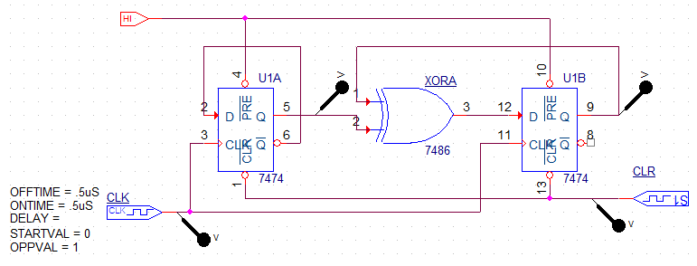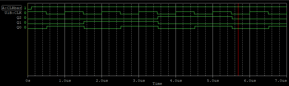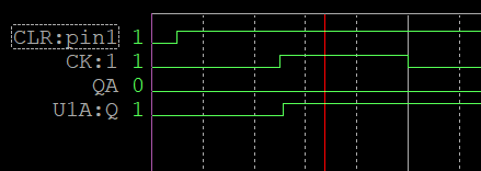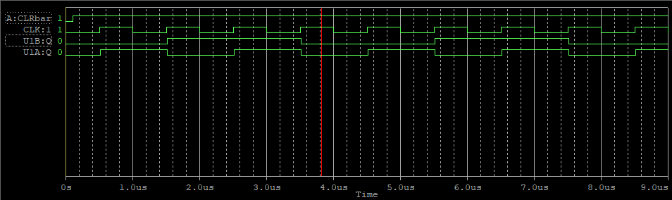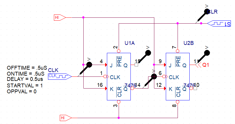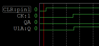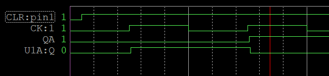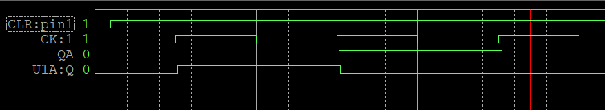 짧은 시간 CLR로 초기값 0,0으로 세팅 그다음 클럭의 하강엣지에서 Q가 토글 그다음 클럭의 하강엣지에서 다시 Q가 토글, 이때 Q는 하강엣지이고 이것을 하강엣지 클럭으로 받아서 Q1이 토글