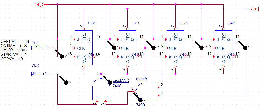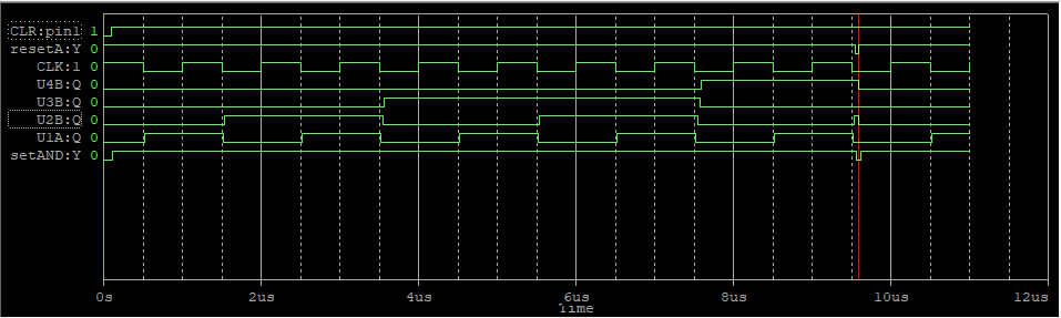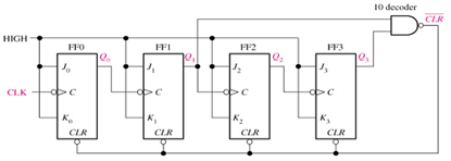 처음 짧은 시간 CLR로 초기값 0,0 세팅 그 후 클럭마다 카운트가 동작하다가 9에서 다음 클럭때 아주 짧은 시간 10(1010)이 되고 CLR 과 NAND게이트가 연결된 AND게이트에 의해 모두 클리어되고 다시 0부터 카운터 시작