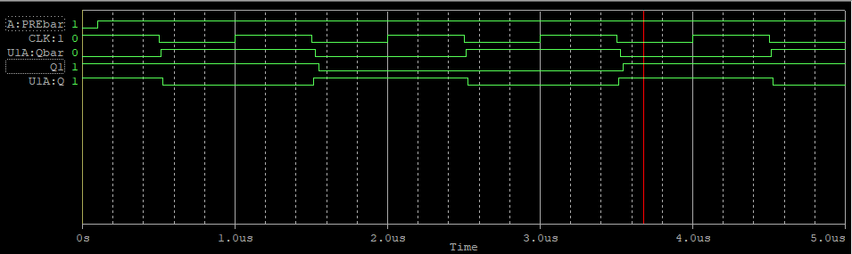 짧은 시간 PRE로 초기값 1,1로 세팅 그다음 하강엣지에서 Q가 토글 그 다음 하강엣지에서 Q가 다시 토글(Q가 토글 되면서 Q`역시 같이 토글) Q`의 하강엣지를 클럭으로 받아 Q1이 토글