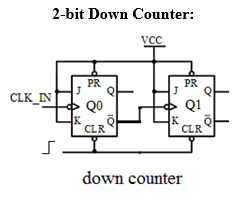 업 카운터의 두 번째 클락에 Q가 아닌 Q`(Qbar)를 연결하고 초기 세팅을 (1,1)을 하면 다운 카운터가 된다