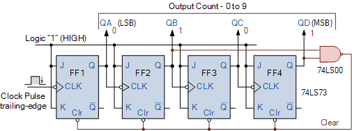 (Q3,Q2,Q1,Q0)순서, 0~9(1001)까지 카운트하다가 10(1010)이 되면 리셋 된다