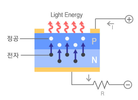 전자가 정공으로 이동하면서 에너지 준위가 낮아지고 그 차이만큼 빛으로 내놓는다