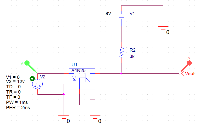 Vin 디지털 펄스가 인가되면, 그에 따라 LED가 온/오프 된다. 그러면 LED의 빛에 의해 포토트랜지스터도 온/오프된다. 출력 Vout은 포토트랜지스터가 온되면 접지와 연결되고, 오프되면 Vcc와 연결된다.