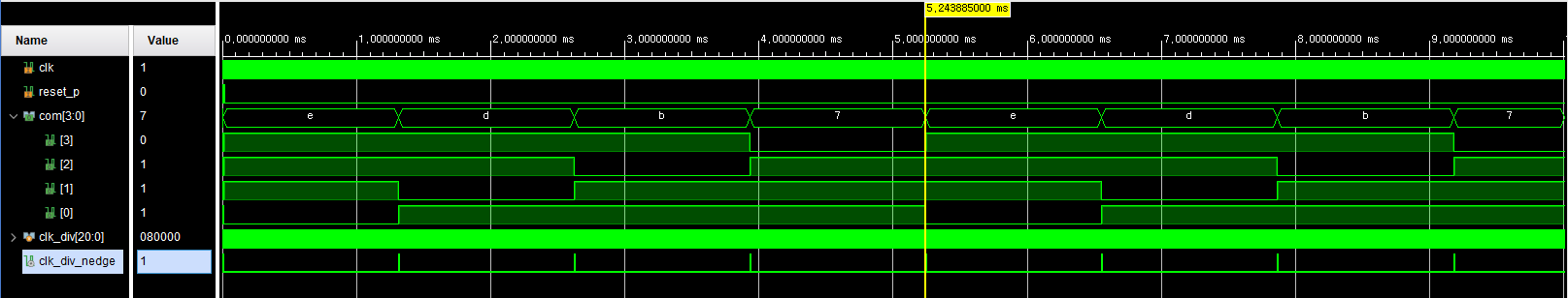대략 1ms의 주기를 위해 21개비트 크기의 레지스터중 17번째비트를 사용하요 분주(2^17*10ns=1.3ms), FND의 com에 0인곳이 출력된다