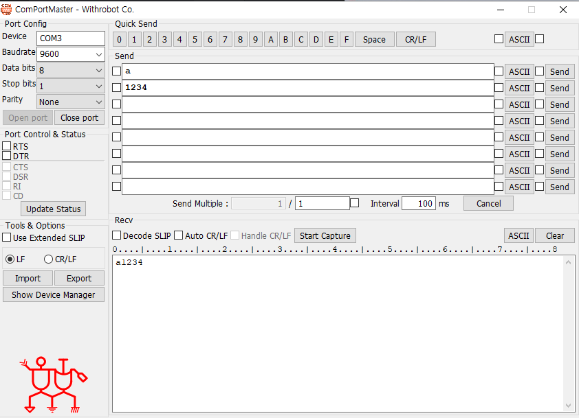 문자 'a'를 보내면 led 켜짐, 문자 'b를 보내면 led 꺼짐