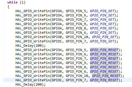 HAL_GPIO_WritePin에서(A/B/C중에서 선택, 사용할 핀 번호 선택, SET(1) 또는 RESET(0));