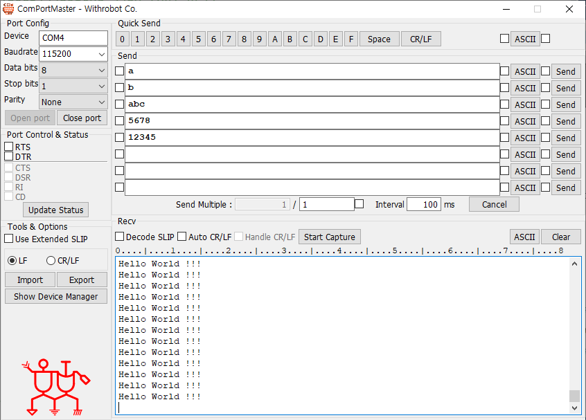 PC의 comportmaster를 통해 uart로 연결후 문자를 보내면 value값이 바뀜