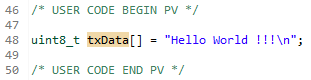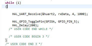 main.c에서 while문 안에 코드를 넣는데 주의할점은 코드를 넣으려는 구간의 BEGIN, END안에 넣어야한다 그렇지 않으면 빌드할때 사라짐 아니면 주석을 없에면됨
