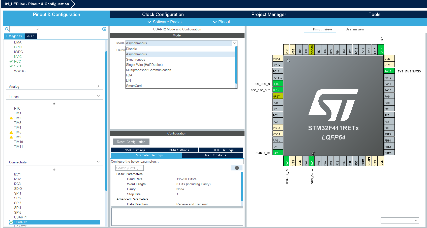 왼쪽 창에서 Connectivity에서 USART클릭 (현재 usart2사용), 오른쪽창 Mode에서 Asynchronous