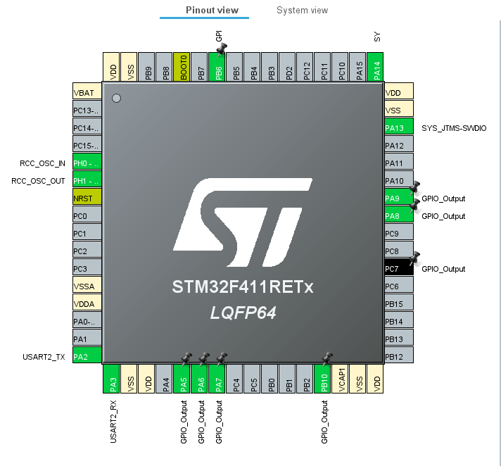 해당하는 핀에 output설정을 한다 (Pinout view를 먼저 설정하고 거기에 맞게 핀을 stm32보드에 꽂으면 들쭉날쭉하게 꽂아야한다)