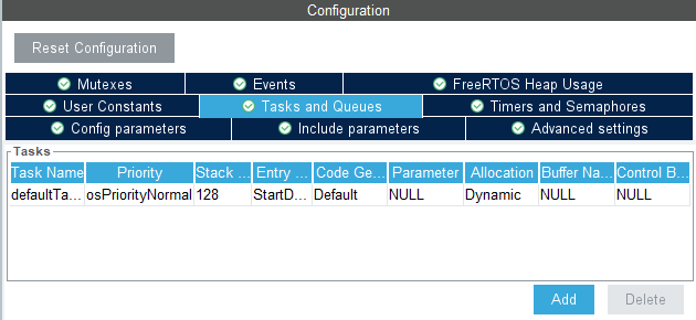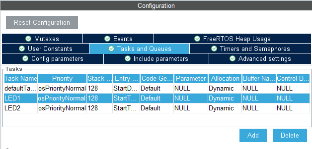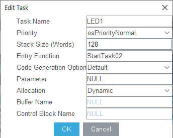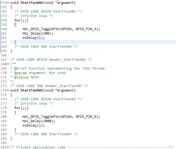 LED1, LED2로 추가한 TASK가 2개가 추가되어있고 StartTask라고 되어있는 그중에서 while문의 역할을 하는 For(;;)안에 동작 코드를 추가하면 된다